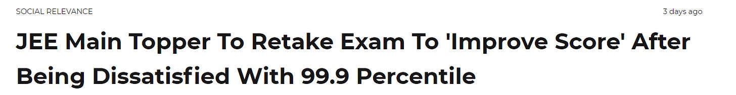 This could be straight out of The Onion, but it's true - Chinmay M, from Mumbai, achieved a score of 99.956 percentile in the Joint Entrance Examination (JEE) Main 2022's first session. But he is unhappy and wants to take the exam again to improve his score. These toppers I tell you..